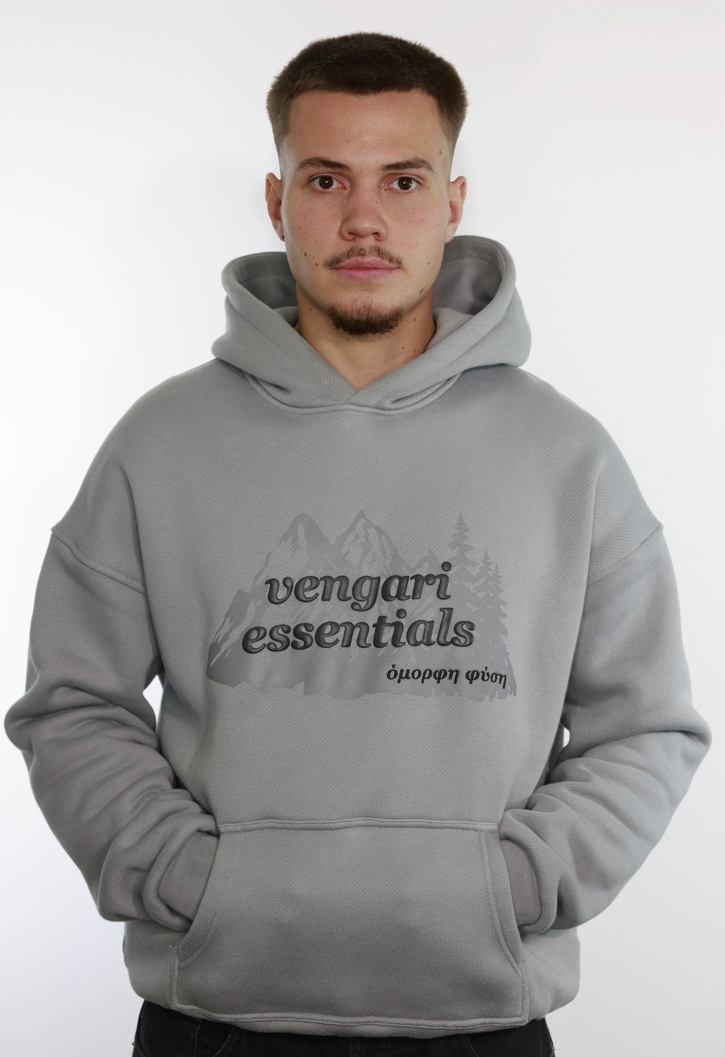 - Siebdruck Bergmotiv, „vengari essentials“ Puffprint und „όμορφη φύση“ Stick auf der Brust